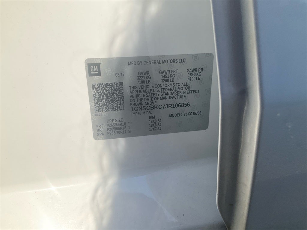 Jet Black/Dark Ash Leather, 1st & 2nd Row Color-Keyed Carpeted Floor Mats, 2nd Row 60/40 Split-Folding Manual Bench, 3rd Row Manual 60/40 Split-Folding Fold Flat Bench, 4-Wheel Antilock Disc Brakes w/Brake Assist, 5 12-Volt Auxiliary Power Outlets, Auto-Dimming Inside Rear-View Mirror, Black Assist Steps, Bose Premium 9-Speaker System, Cargo Net, Color-Keyed Carpeting Floor Covering, Driver Inboard & Front Passenger Airbags, Electronic Cruise Control w/Set & Resume Speed, Enhanced Driver Alert Package (Y86), Extended-Range Remote Keyless Entry, Floor Console, Forward Collision Alert, Front Passenger 6-Way Power Seat Adjuster, IntelliBeam Headlamps, Lane Keep Assist w/Lane Departure Warning, Leather-Wrapped Steering Wheel, License Plate Front Mounting Package, Low Speed Forward Automatic Braking, Memory Settings, OnStar Basic Plan For 5 Years, Power Liftgate, Power-Adjustable Accelerator & Brake Pedals, Preferred Equipment Group 1LT, Premium Smooth Ride Suspension Package, Rear Park Assist w/Audible Warning, Remote Vehicle Start, Roof-Mounted Luggage Rack Side Rails, SiriusXM Satellite Radio, Universal Home Remote.